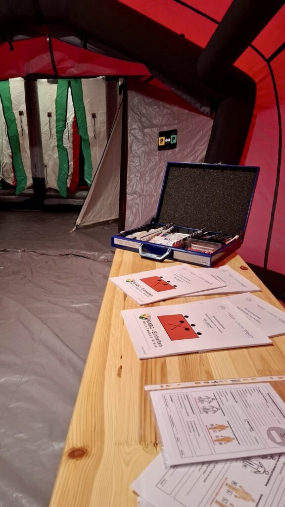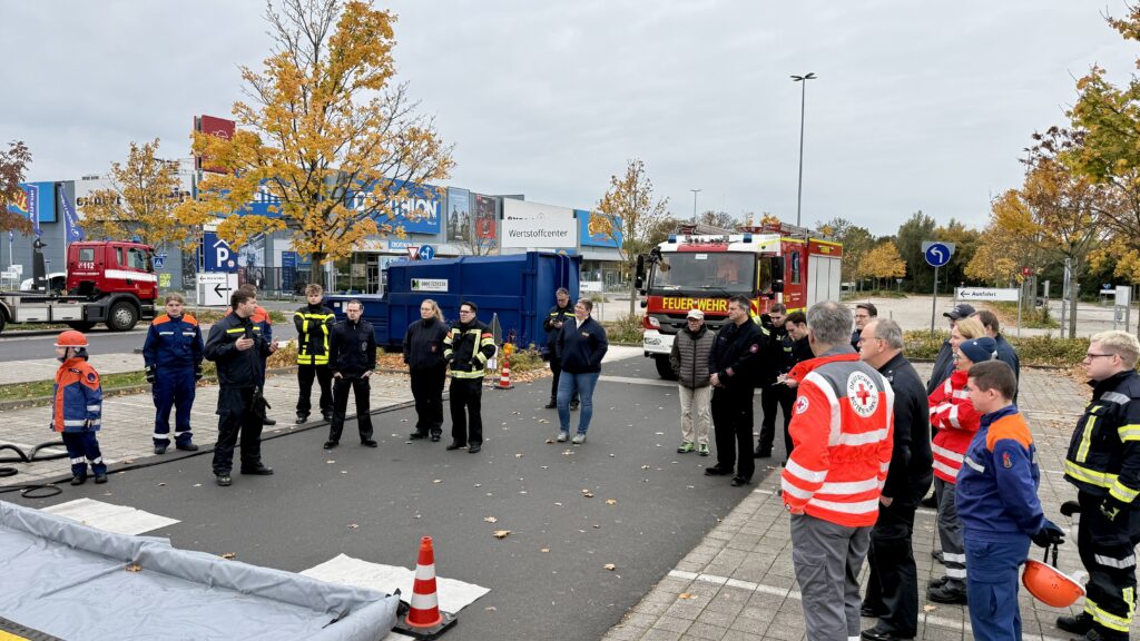 Nach Abschluss der praktischen Teile waren auch Führungskräfte aus Feuerwehr und Rettungsdienst sowie Vertreter benachbarter Kreise eingeladen, sich über den Aufbau und die Abläufe zu informieren. Der Austausch bot Gelegenheit, Kontakte zu vertiefen und neue Synergien zu schaffen – insbesondere im Hinblick auf überörtliche Unterstützungsmaßnahmen bei Gefahrstofflagen.