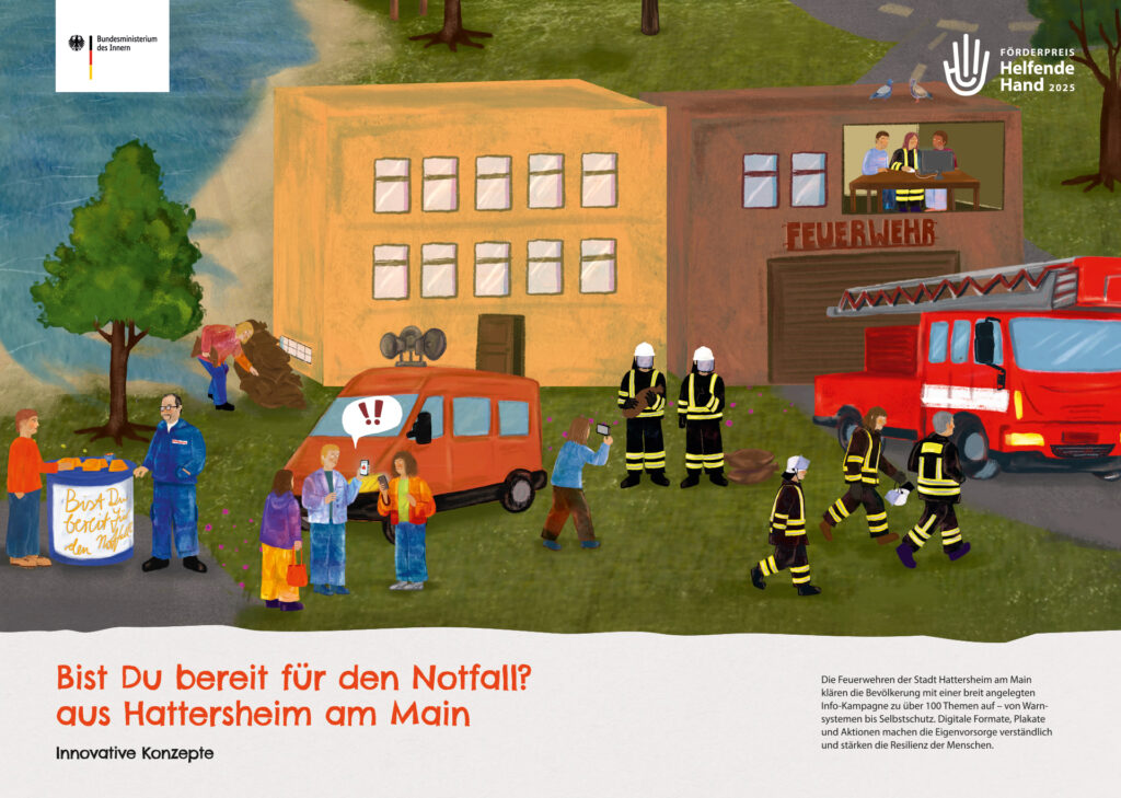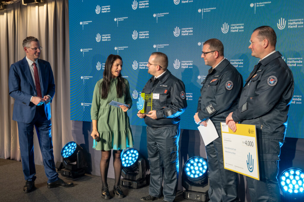 Beim bundesweiten Förderpreis „Helfende Hand“, verliehen durch das Bundesministerium des Innern, erreichten die Hattersheimer Feuerwehren den 3. Platz in der Kategorie „Innovative Konzepte“. Aus knapp 400 Bewerbungen wurden nur 16 Initiativen nominiert, und die Hattersheimer Kampagne „Bist Du bereit für den Notfall?“ überzeugte die Fachjury durch ihren breiten Informationsansatz und die Kombination aus digitalen und analogen Formaten zur Notfallvorsorge.