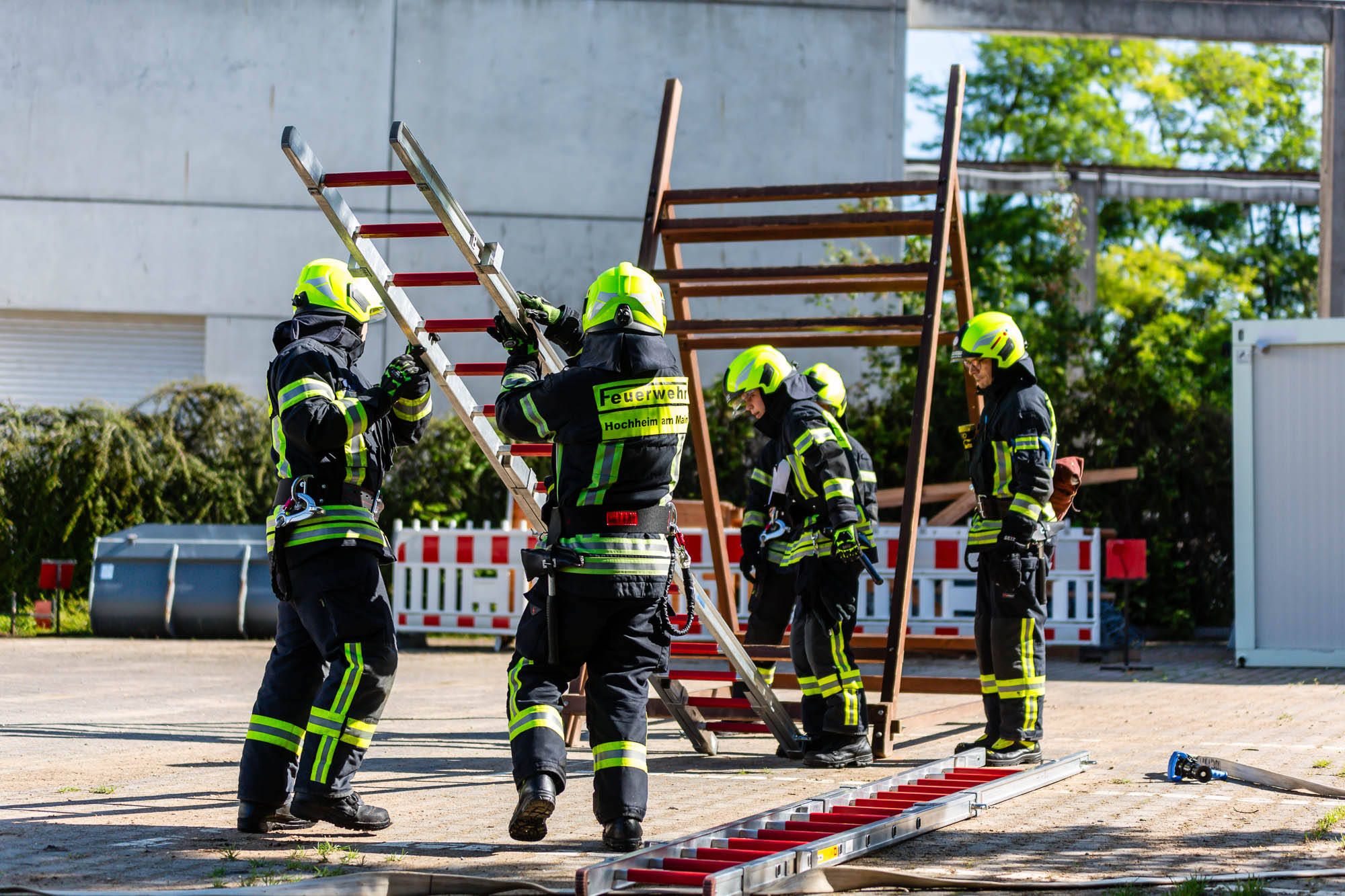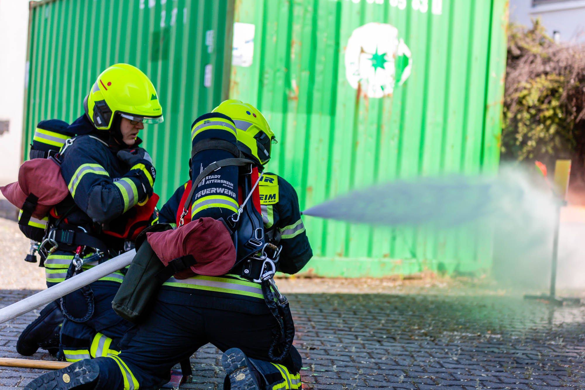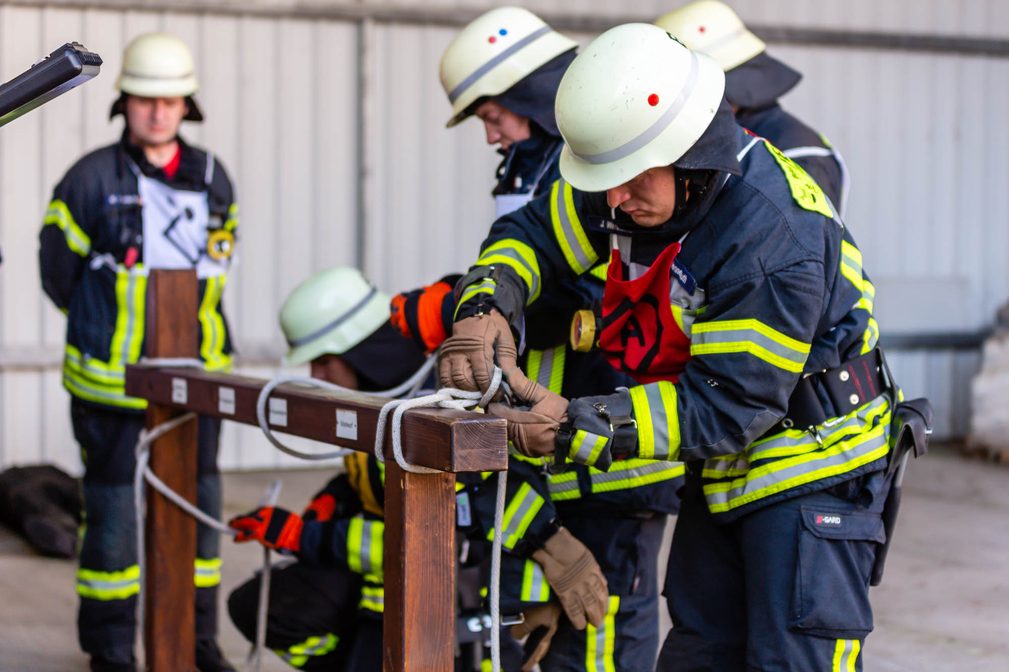 Im zweiten Angriff wird dann ein C-Strahlrohr von der Steckleiter aus zum Einsatz gebracht, wobei auch drei Fallklappen umgespritzt werden müssen. Besonderes Augenmerk bei der Übung wird auf die Einhaltung der geltenden Dienstvorschriften und die saubere Abwicklung der Funkgespräche und Rückmeldungen gelegt. Zu guter Letzt führen vier ausgeloste Teilnehmende auf Zeit feuerwehrtechnische Knoten aus. Diese Knoten gehören zum Grundwissen und können im Ernstfall enorm wichtig werden.